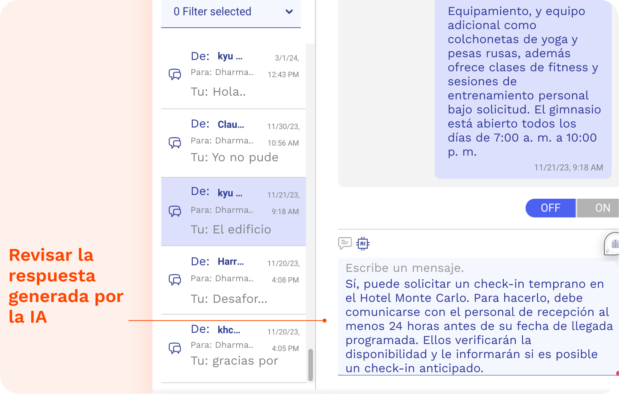 Hoy en día, los huéspedes esperan respuestas y atención inmediata. Con el Asistente de IA para Huéspedes de Dharma, puedes ofrecer ambas cosas: un servicio 24/7, en cualquier idioma y sin sobrecargar a tu equipo.